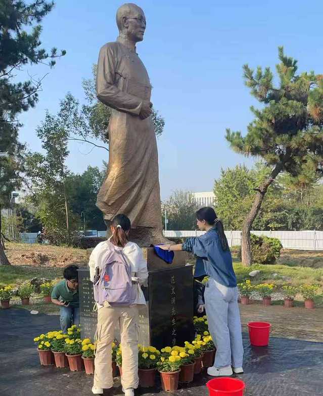 晨光中,师生们默契协作。同学们小心翼翼地擦拭雕像的每一处轮廓,细致拂去岁月积淀的尘埃;后勤老师们带领大家清扫雕像周边环境,不放过任何卫生死角。每一次拂拭,不仅清洁了校园,更是一次对校史的温情致敬。擦拭完毕,同学们依次献上鲜花,肃立鞠躬,以无声的仪式表达对学术先辈的深切缅怀与崇高敬意。
