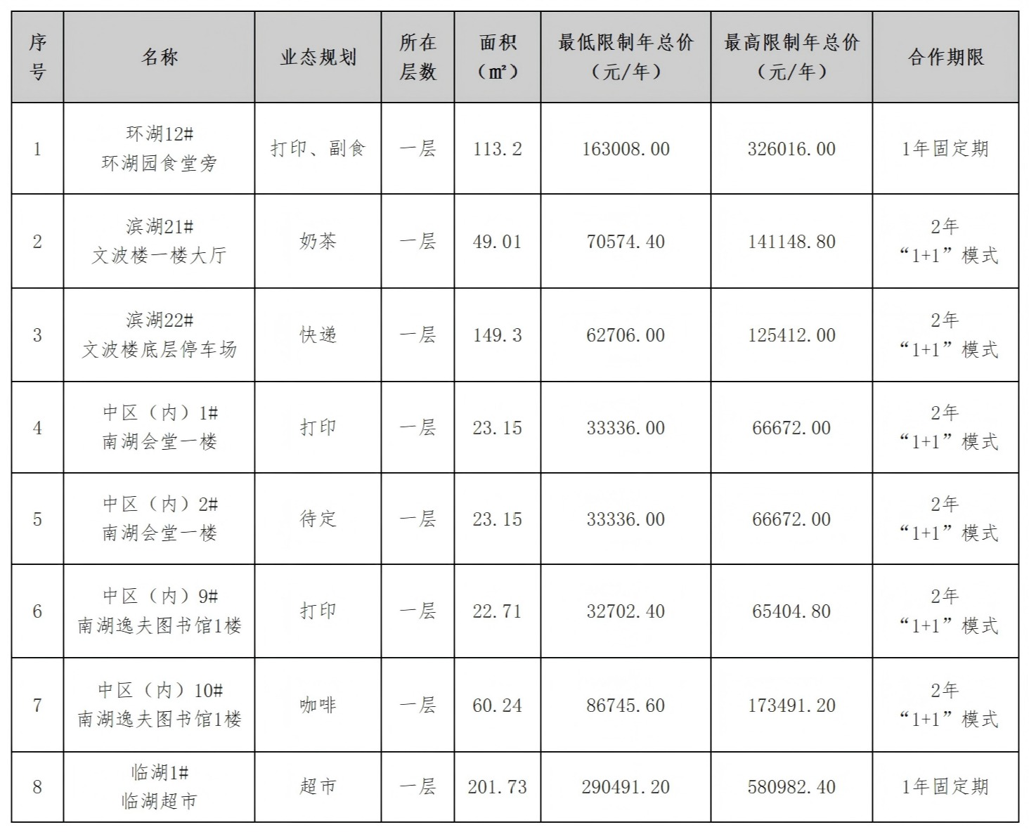 (三)业态及面积:本项目共包含8个规划业态门店,总面积642.49㎡,分布于南湖校区环湖、滨湖、中区、临湖等区域,各门店具体信息如下: